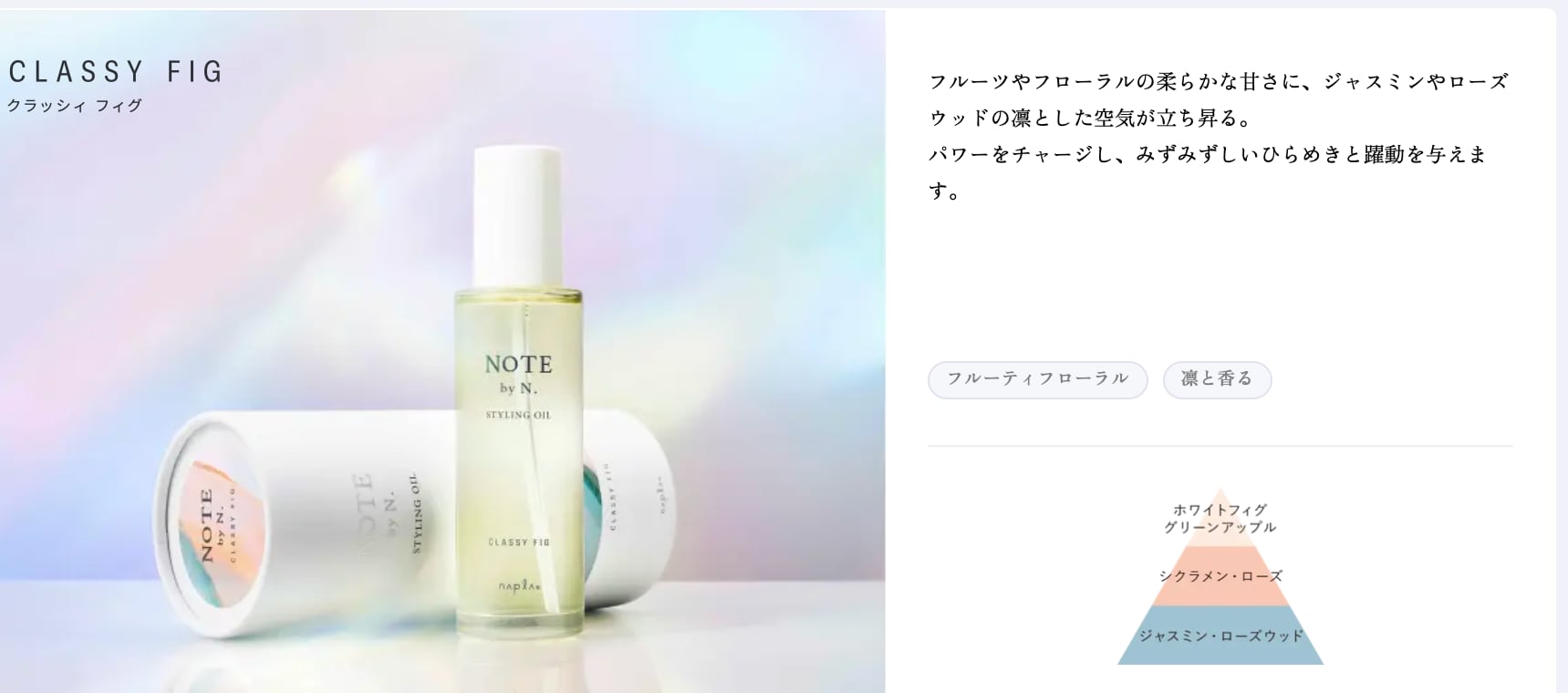 フルーツやフローラルの柔らかな甘さに、 ジャスミンやローズウッドの凛とした空気が立ち昇る。 パワーをチャージし、みずみずしいひらめきと躍動を与えます。